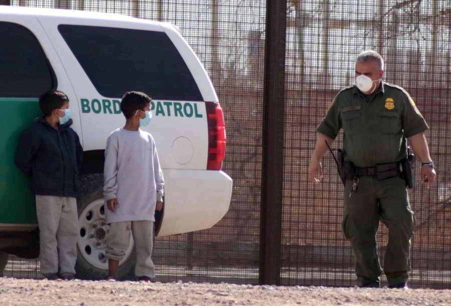 这张3月27日在墨西哥华雷斯拍摄的照片显示,两名来自危地马拉的移民儿童在跨越美墨边境的里奥格兰德河后,等待接受美国边境巡逻队人员的处理。(新华社发,戴维·佩纳多摄)