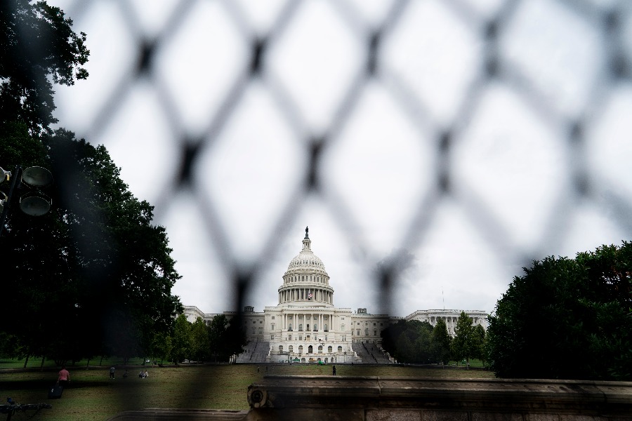 这是9月17日在美国首都华盛顿透过隔离围栏拍摄的国会大厦。(新华社记者刘杰摄)