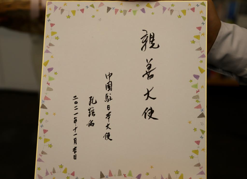中国驻日本大使孔铉佑为熊猫幼崽“枫浜”题写的“亲善大使”祝福卡。新华社记者姜俏梅摄
