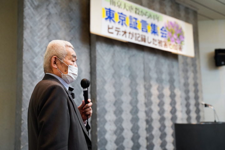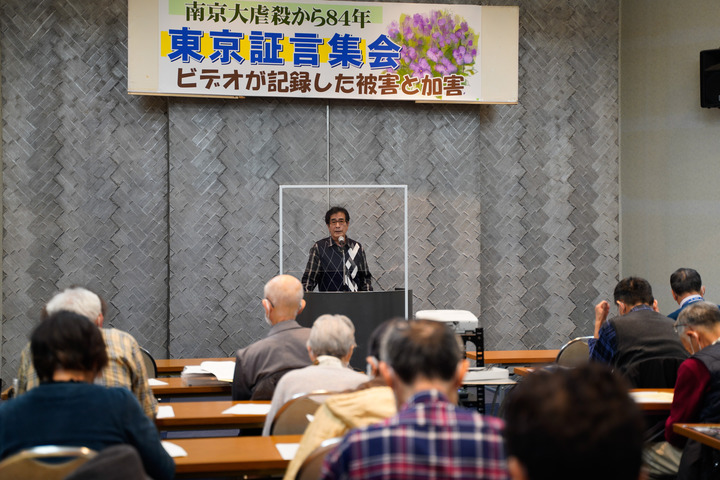 12月11日,在“南京大屠杀84周年证言会”上,东京都公立高中退休历史教师甲野信夫讲话。新华社记者张笑宇摄