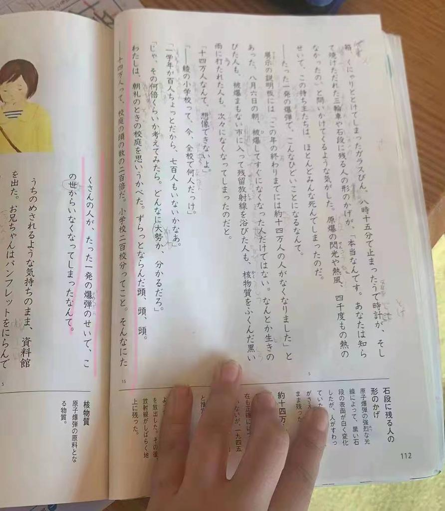 据记者了解,日本小学从三年级开始,国语(语文)教材中都有关于广岛原子弹爆炸、东京轰炸的相关文章,主要讲述日本普通民众的惨痛经历。