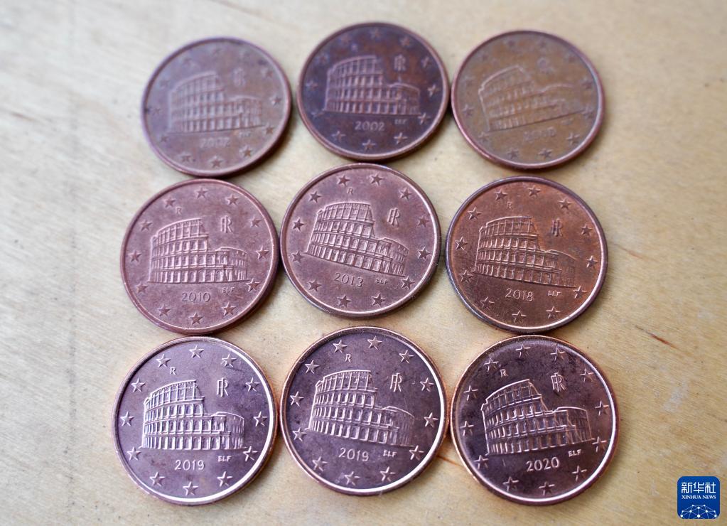 这是2021年12月30日在意大利罗马拍摄的由意大利发行的不同年份的5欧分硬币,背面印有斗兽场图案。新华社记者 金马梦妮 摄