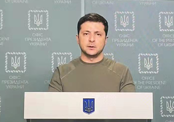 这是2月25日在乌克兰基辅拍摄的乌总统泽连斯基发表讲话的视频画面。(新华社发,波多普列洛娃·娜佳摄)