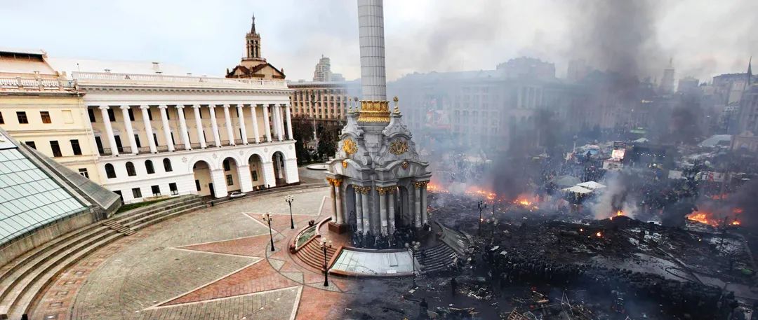 ▲ 2014年2月,乌克兰首都基辅市中心的独立广场在示威运动后沦为废墟,图为示威前后的独立广场对比图。为期93天的示威活动共造成123人死亡,逾2000人受伤。