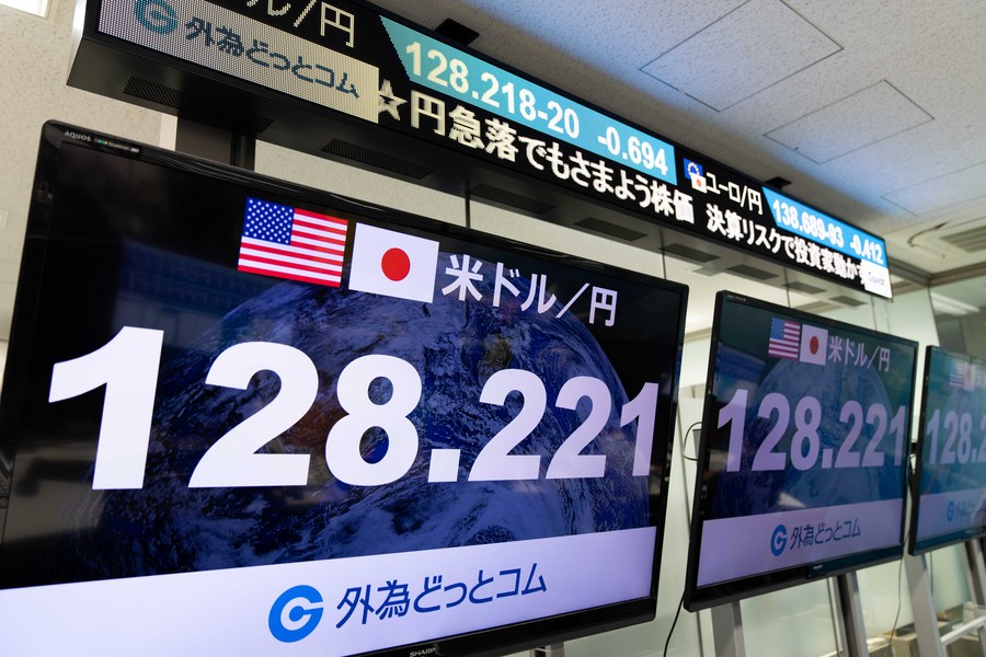 2022年4月20日,在日本东京,一家外汇经纪公司的大屏幕上显示着日元与美元的实时汇率情况。(新华社记者张笑宇摄)