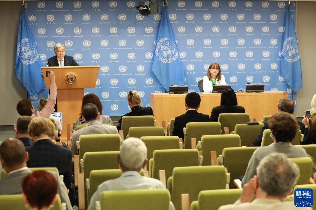6月8日,在位于纽约的联合国总部,联合国秘书长古特雷斯(左)出席联合国全球粮食、能源和金融危机应对小组报告发布会时讲话。