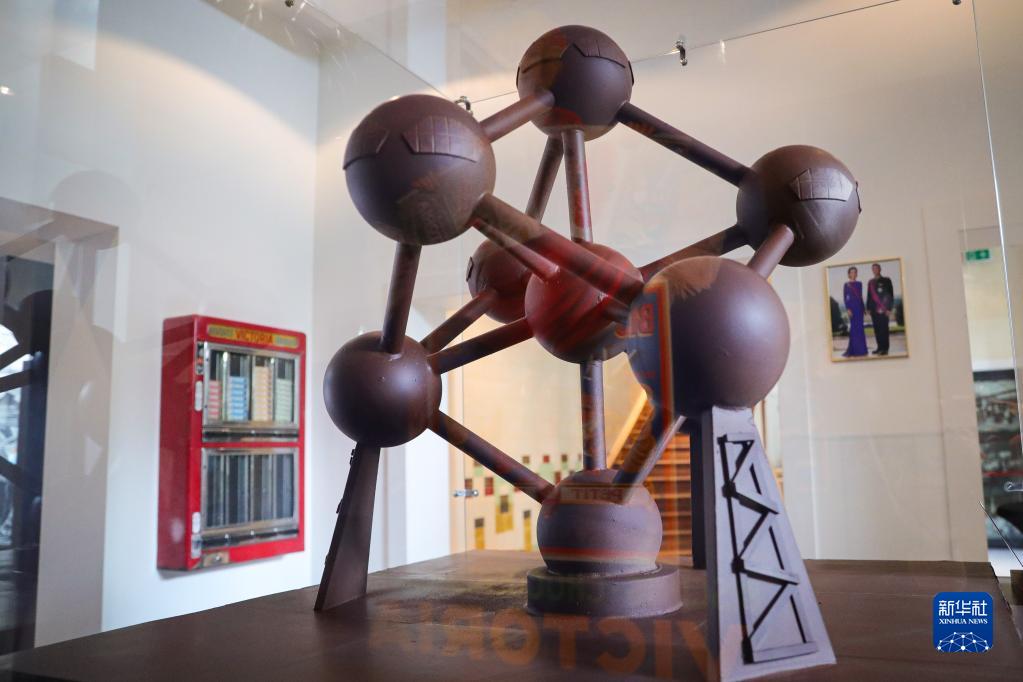 这是6月9日在比利时布鲁塞尔的“比利时巧克力村”拍摄的微缩巧克力版布鲁塞尔标志性建筑原子球塔。