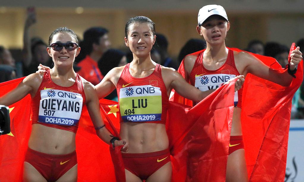 这是2019年多哈世锦赛,冠军刘虹(中)、亚军切阳什姐(左)与季军杨柳静在女子20公里竞走比赛后庆祝↓