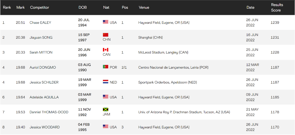 这是目前女子铅球赛季前八的成绩↓
