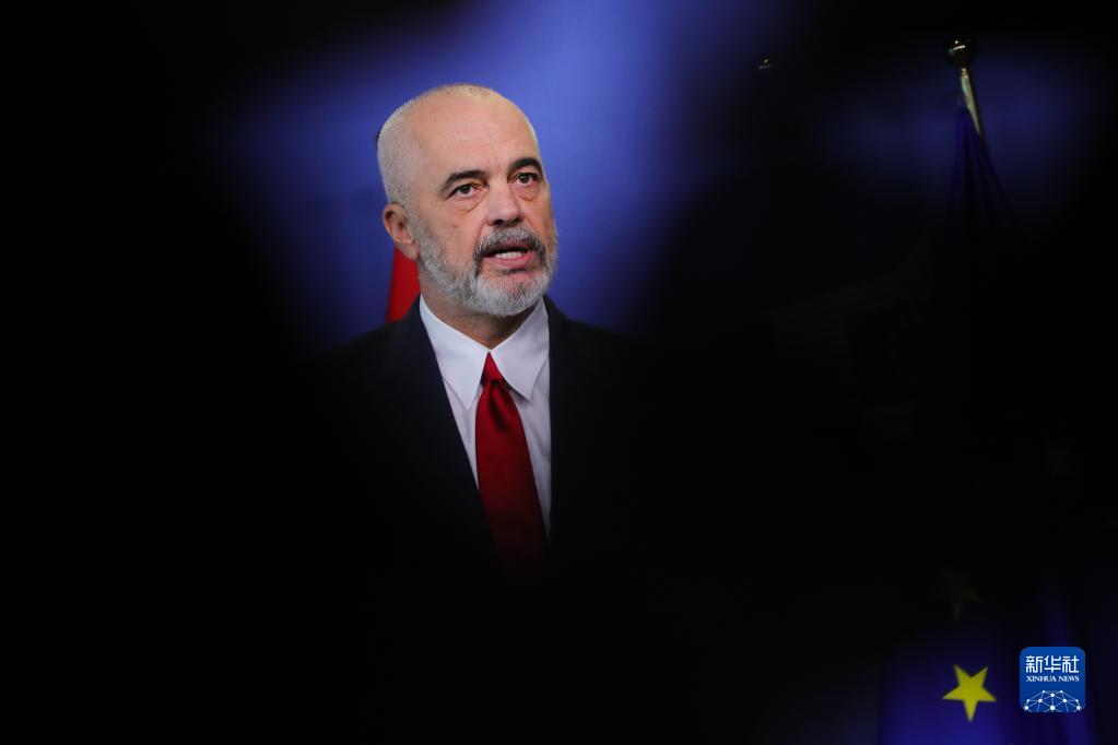 7月19日,在比利时布鲁塞尔,阿尔巴尼亚总理拉马在记者会上讲话。
