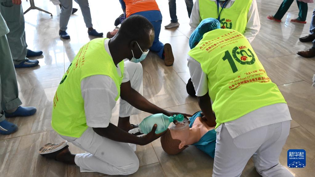 10月10日,在几内亚首都科纳克里,中国援几内亚医疗队队员为中几友好医院的医护人员开展海姆立克急救培训。新华社发