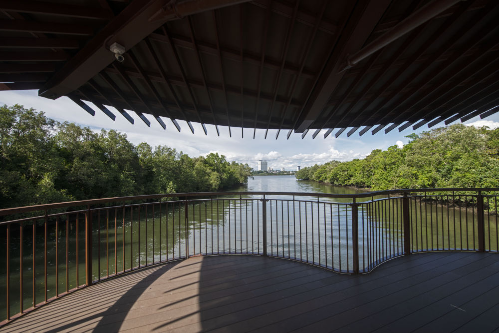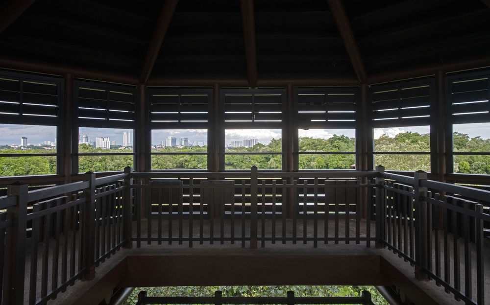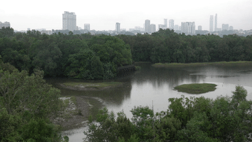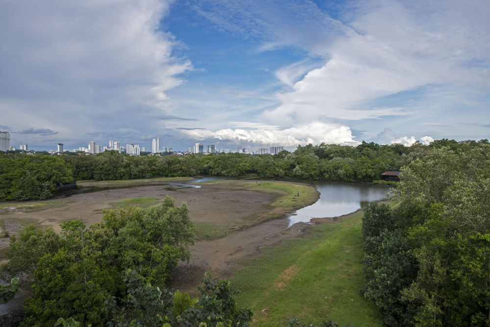 ↑新加坡双溪布洛湿地保护区与城市高楼比邻而居。