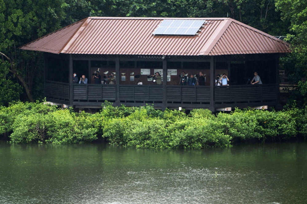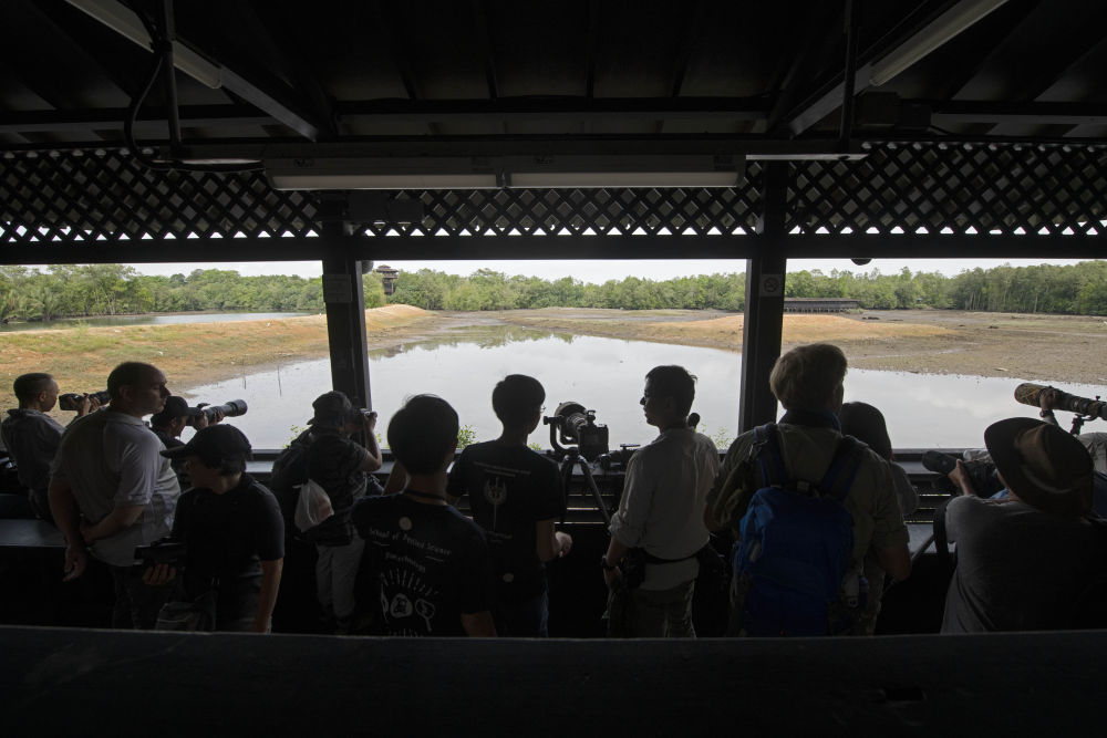 ↑摄影爱好者在双溪布洛湿地保护区的观鸟台上拍照。