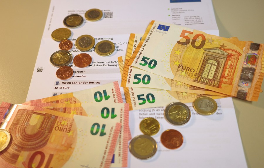 这是德国柏林拍摄的一户居民家的天然气账单和一些欧元钱币。(新华社记者任鹏飞摄)