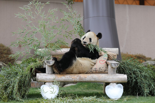 2019年2月14日,在日本和歌山县白浜野生动物园,大熊猫“永明”倚着“靠垫”吃竹子。新华社记者杜潇逸摄