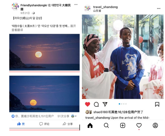 随着海外市场出现现实场景带入社交媒体的趋势,好客山东境外新媒体全平台顺势而为添加了各种真人实景元素到推广内容中,提高了受众度。如将外国留学生在山东过中秋节活动现场,通过图文的方式展示到好客山东的境外新媒体平台上,让海外用户沉浸式了解、体验中国传统文化,将“好客”二字体现得淋漓尽致。