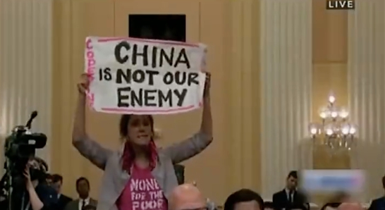 报道称,这些抗议者来自一个名叫“粉红准则”(“CODEPINK”)的团体,该团体反对美国参与战争以及“试图促使(他国)政权更迭”。根据该团体发布的新闻稿,“粉红准则”的组织者奥利维亚·迪努奇在听证会上举着“中国不是我们的敌人”的标语,迪努奇在被带出听证会会场前传达了“美国人民需要合作,而不是与中国竞争”的信息。
