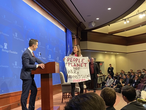 2月16日,迪努奇在华盛顿一家智库活动上打断霍利的演讲 图源:“粉色准则”(CODEPINK)官方网站