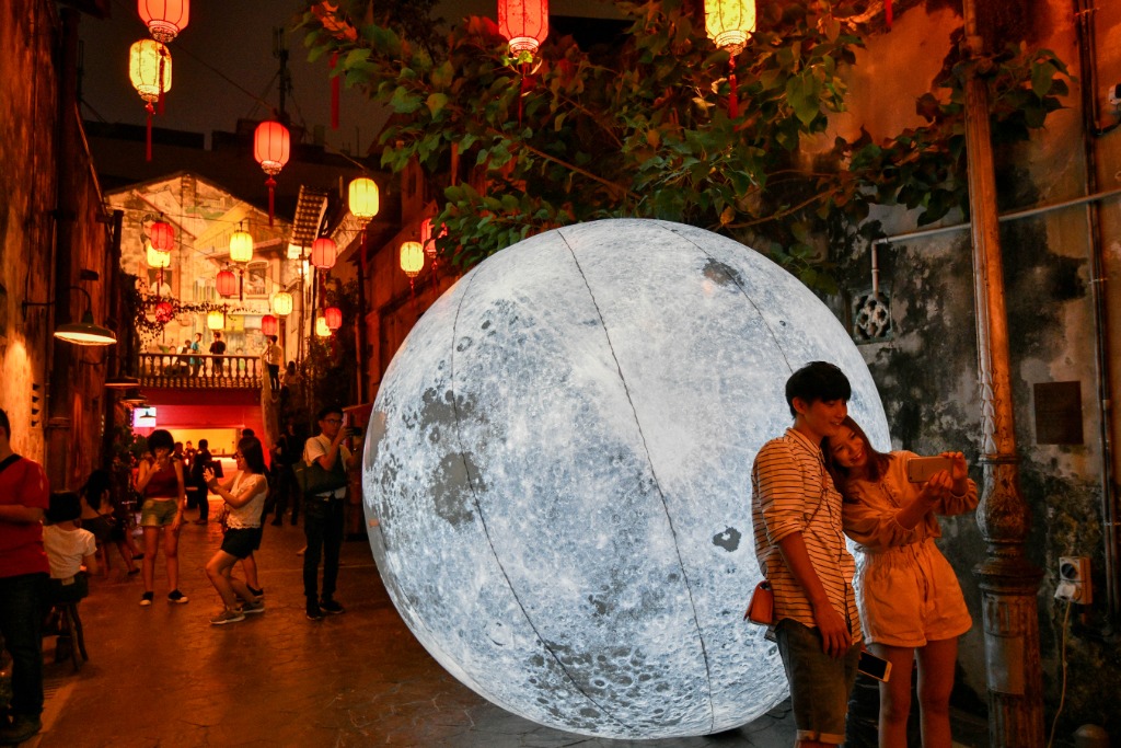 2019年9月13日,在马来西亚吉隆坡,市民在月亮模型气球前拍照留念。新华社发(张纹综摄)