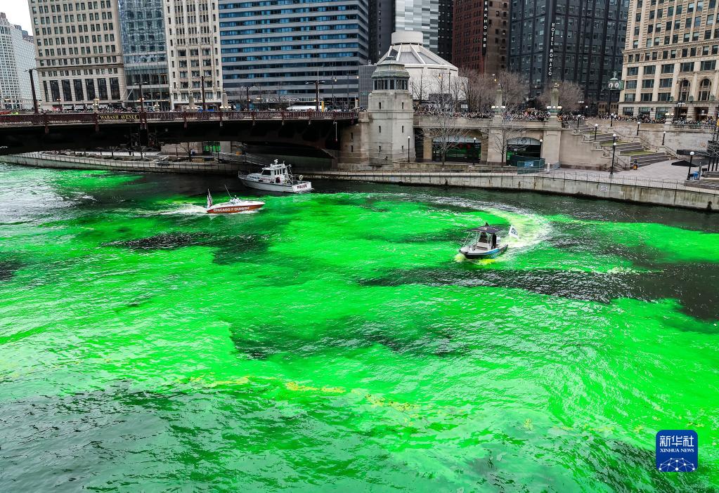 3月11日,美国芝加哥市中心的芝加哥河被染成绿色,迎接即将到来的圣帕特里克节。