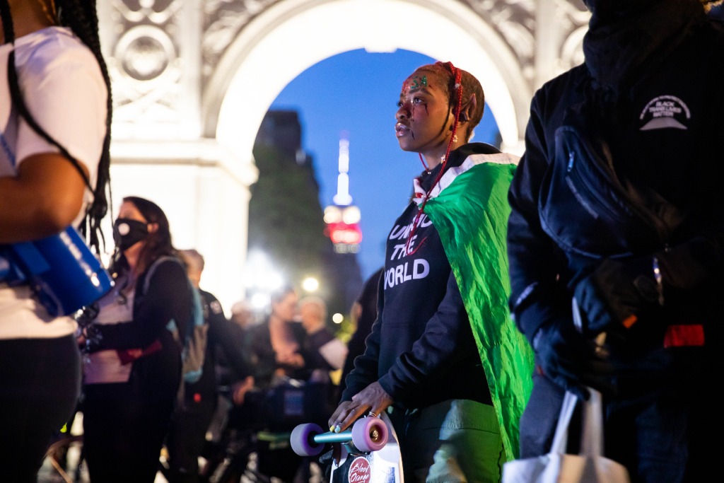 2021年5月31日,在美国纽约,一名参加纪念塔尔萨种族屠杀一百周年活动的女子额头贴有“塔尔萨”字样的装饰。新华社发(郭克摄)