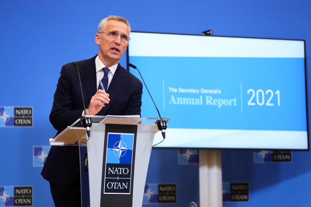 2022年3月31日,在比利时布鲁塞尔,北约秘书长斯托尔滕贝格在新闻发布会上讲话。新华社记者郑焕松摄
