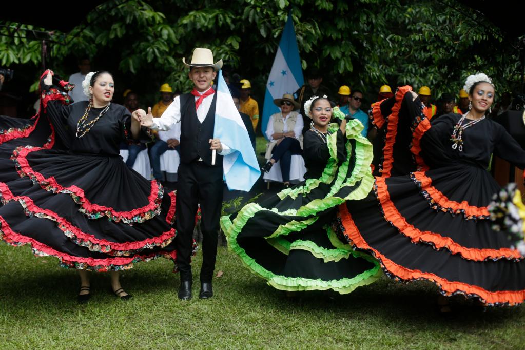 5月30日,舞蹈演员在洪都拉斯圣芭芭拉省圣克鲁斯市洛斯纳兰霍斯公园表演民俗节目。