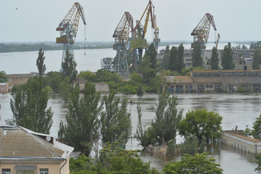 这是6月10日在赫尔松市拍摄的被洪水淹没的第聂伯河一处河港。新华社发(彼得·德鲁克摄)