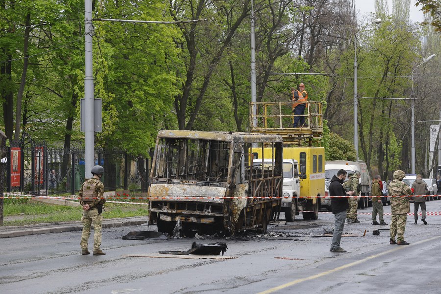 图为2023年4月28日在顿涅茨克拍摄的受损车辆。(维克托摄)