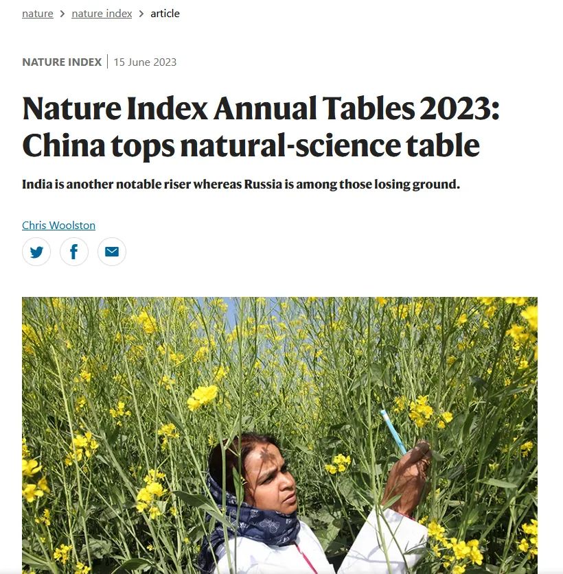 15日由国际知名科技出版社“施普林格-自然出版集团”发布的2023自然指数年度榜单(2023 Nature Index Annual Tables)显示:中国在自然科学领域的研究贡献超越美国,位居榜首。