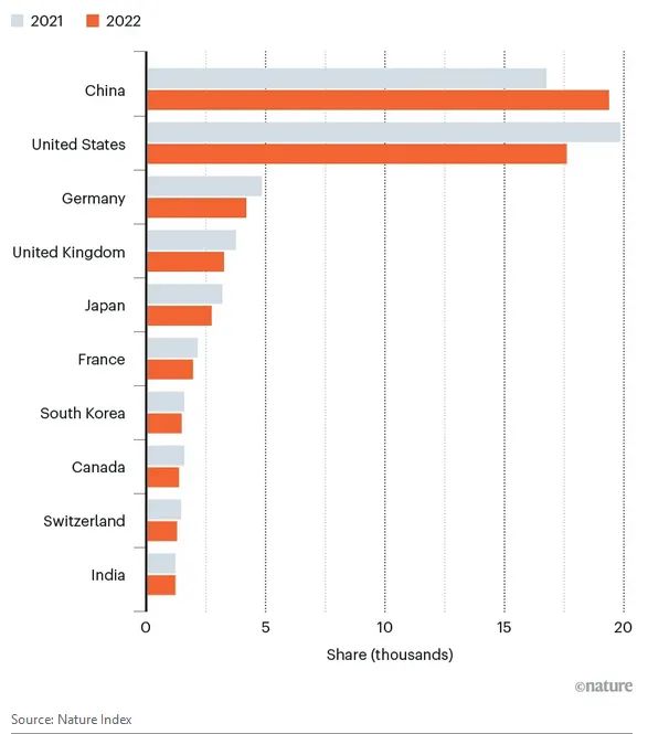 此次最新的自然指数榜单基于2022年1月1日至12月31日的统计数据,展示了不同国家和科研机构在自然科学领域高水平科研产出的情况。