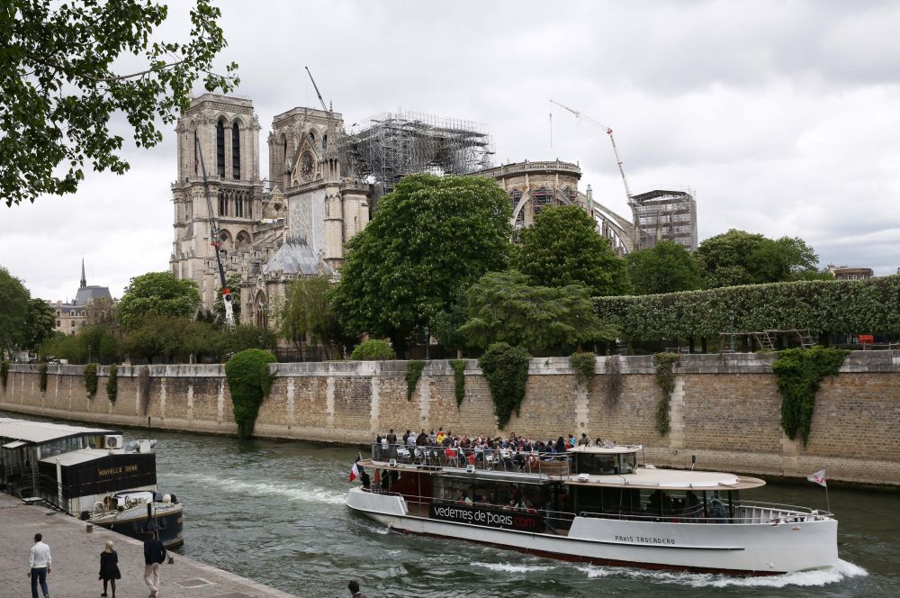 ↑塞纳河上的游船经过巴黎圣母院。