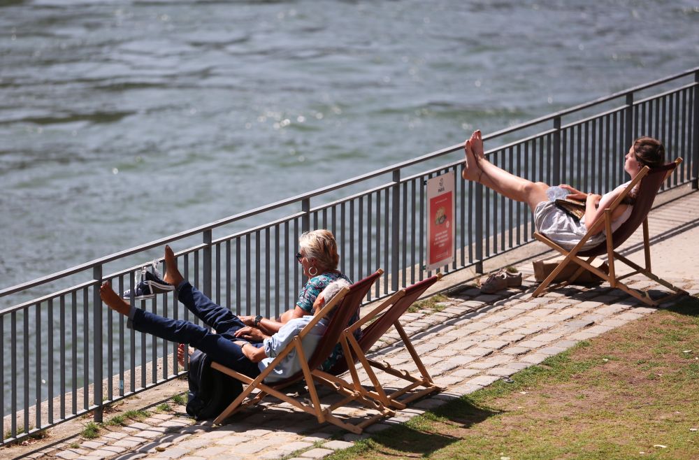 ↑人们参加巴黎塞纳河边举行的沙滩节。