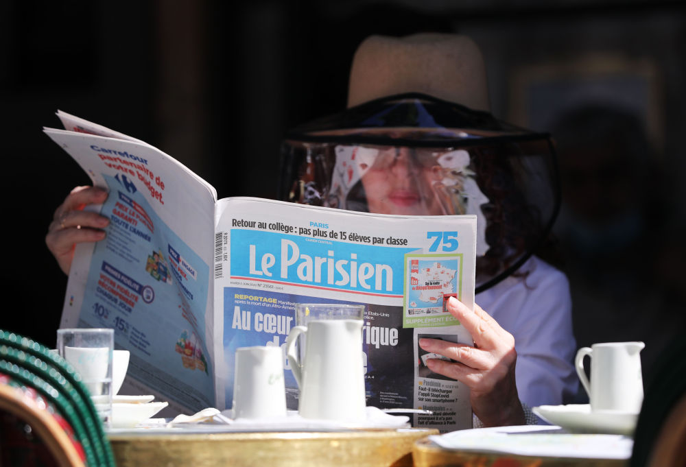 ↑一名巴黎女子在塞纳河边的咖啡馆读《巴黎人报》。