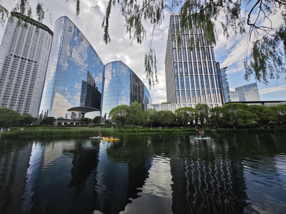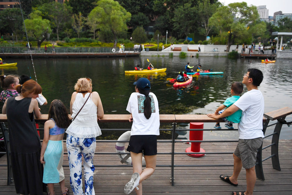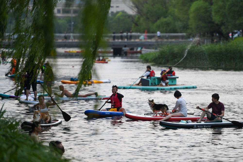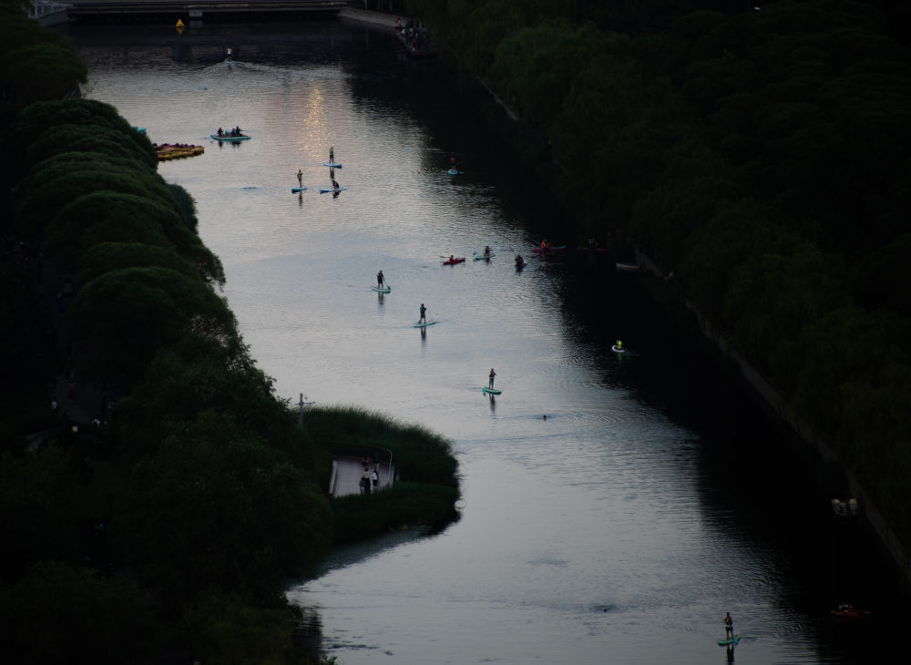 ↑傍晚时分,亮马河上桨板运动正当时。