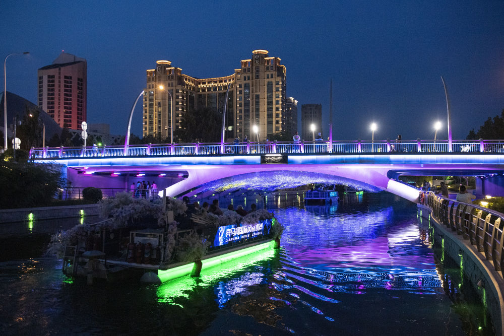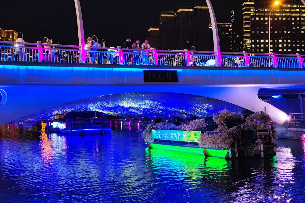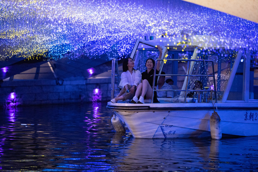 ↑游客乘坐亮马河观光船经过被装点成“星空”的好运桥。