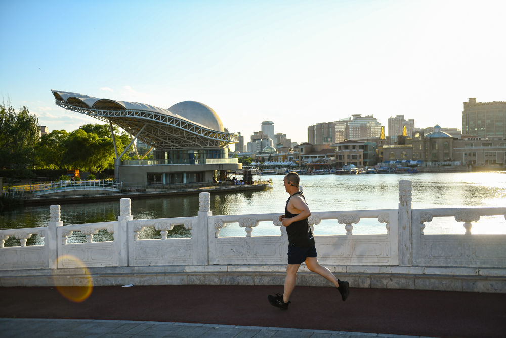 ↑一名男子沿着亮马河跑步时经过朝阳湖上的贝壳剧场。