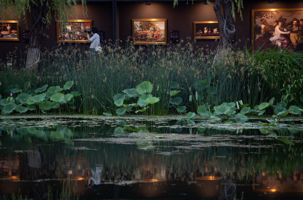 ↑人们在亮马河畔参观欧洲油画展。
