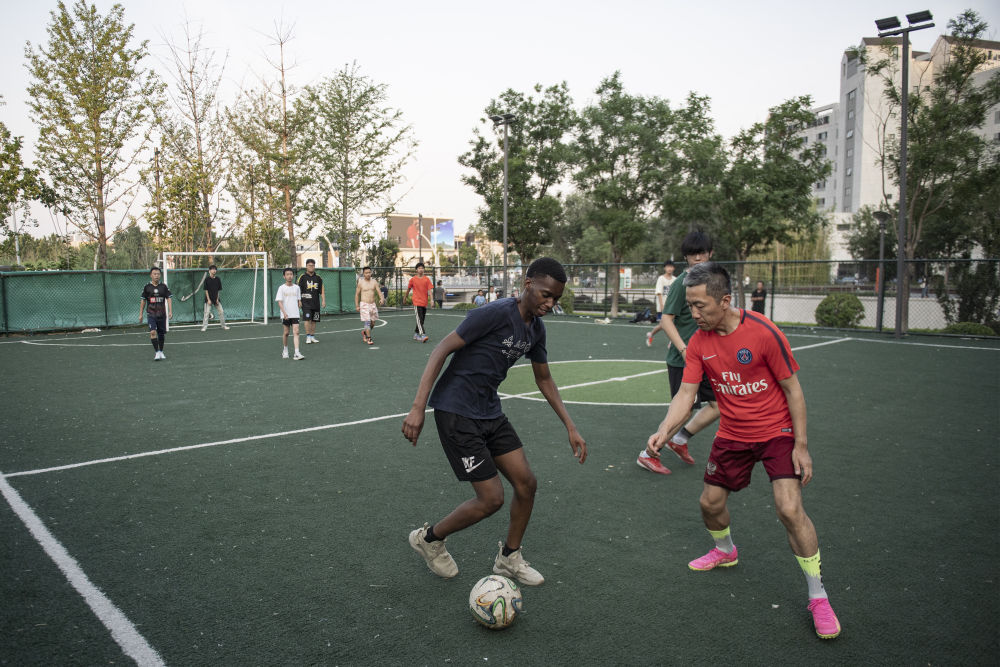 ↑国际友人和本地市民在亮马河畔的足球场踢球。