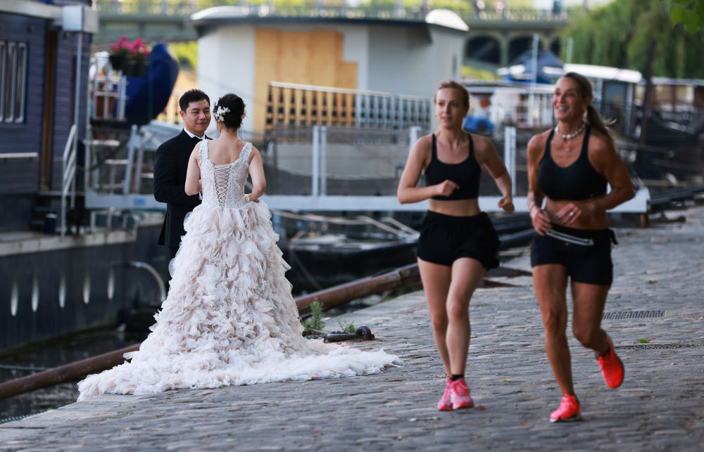 ↑一对来自中国的新人在巴黎塞纳河畔拍摄婚纱照。