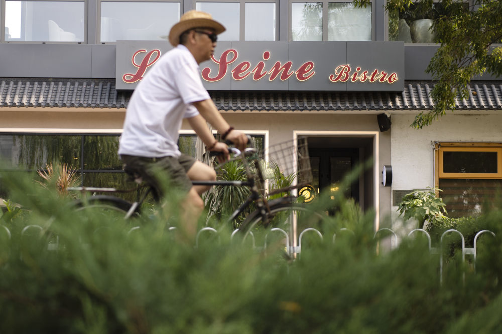 ↑一名北京市民骑车经过亮马河畔一家名为“塞纳河”的西餐厅。