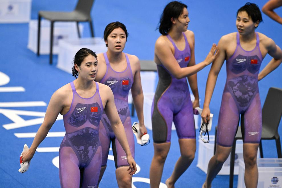 7月23日,中国队选手张雨霏(左一)、吴卿风(左二)、杨浚瑄(右二)、程玉洁(右一)在决赛后。新华社记者 许畅 摄