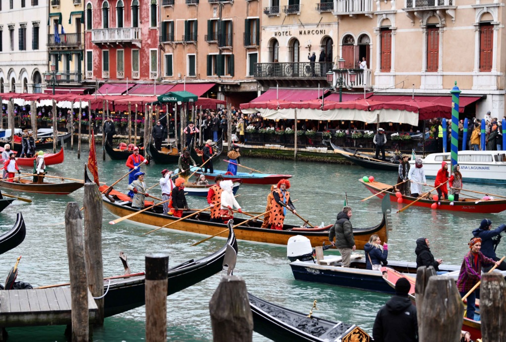 今年2月5日,人们在意大利威尼斯参加花船游行。(新华社记者金马梦妮摄)