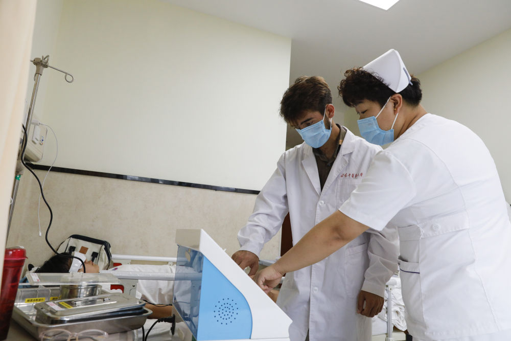 这是7月28日拍摄的土库曼斯坦留学生迪达(左)在甘肃中医药大学附属医院为患者拔罐。新华社记者 方欣 摄
