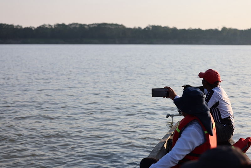 游客在独木舟上寻觅粉色亚马孙河豚。 唐薇 摄