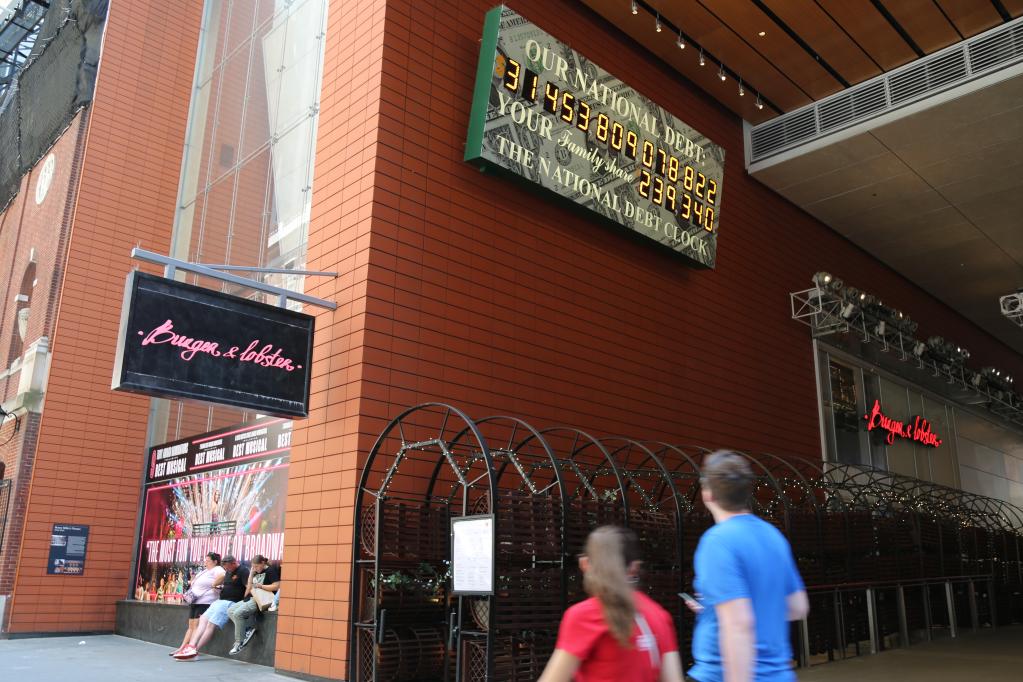 2023年5月29日,人们经过美国纽约曼哈顿的“国债钟”。“国债钟”是一个大型计数器,它实时更新美国的公共债务总额,并显示出每个美国家庭所要负担的数额。新华社记者刘亚南摄