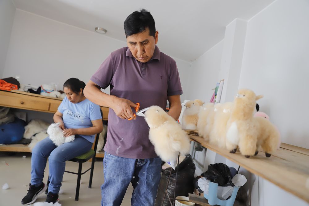 ↑在秘鲁南部城市阿雷基帕的工坊内,马马尼大叔和妻子格洛丽亚打磨准备在上海进博会上展示的羊驼玩偶(10月27日摄)。