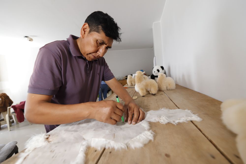 ↑在秘鲁南部城市阿雷基帕的工坊内,马马尼大叔制作羊驼手工艺品(10月27日摄)。