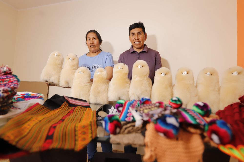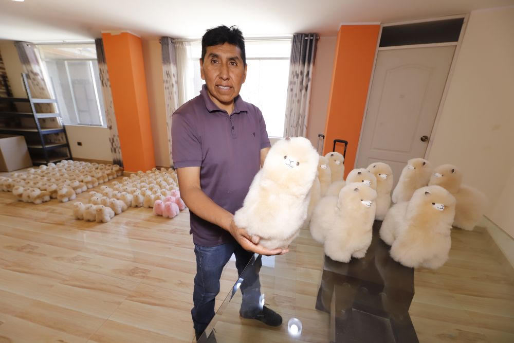 ↑在秘鲁南部城市阿雷基帕,马马尼大叔准备将在上海进博会上展示的羊驼玩偶(10月27日摄)。