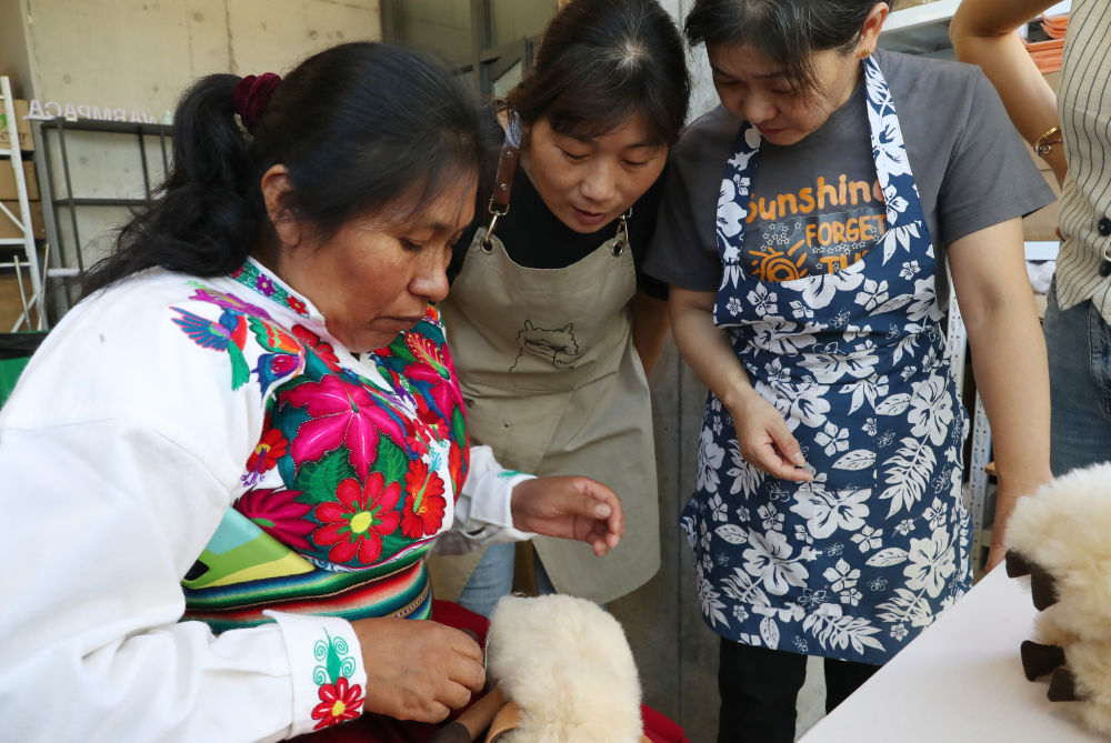 ↑马马尼大叔的妻子格洛丽亚在“温暖驼”品牌位于上海的仓库内向本地员工演示羊驼玩偶修补的针法(11月2日摄)。